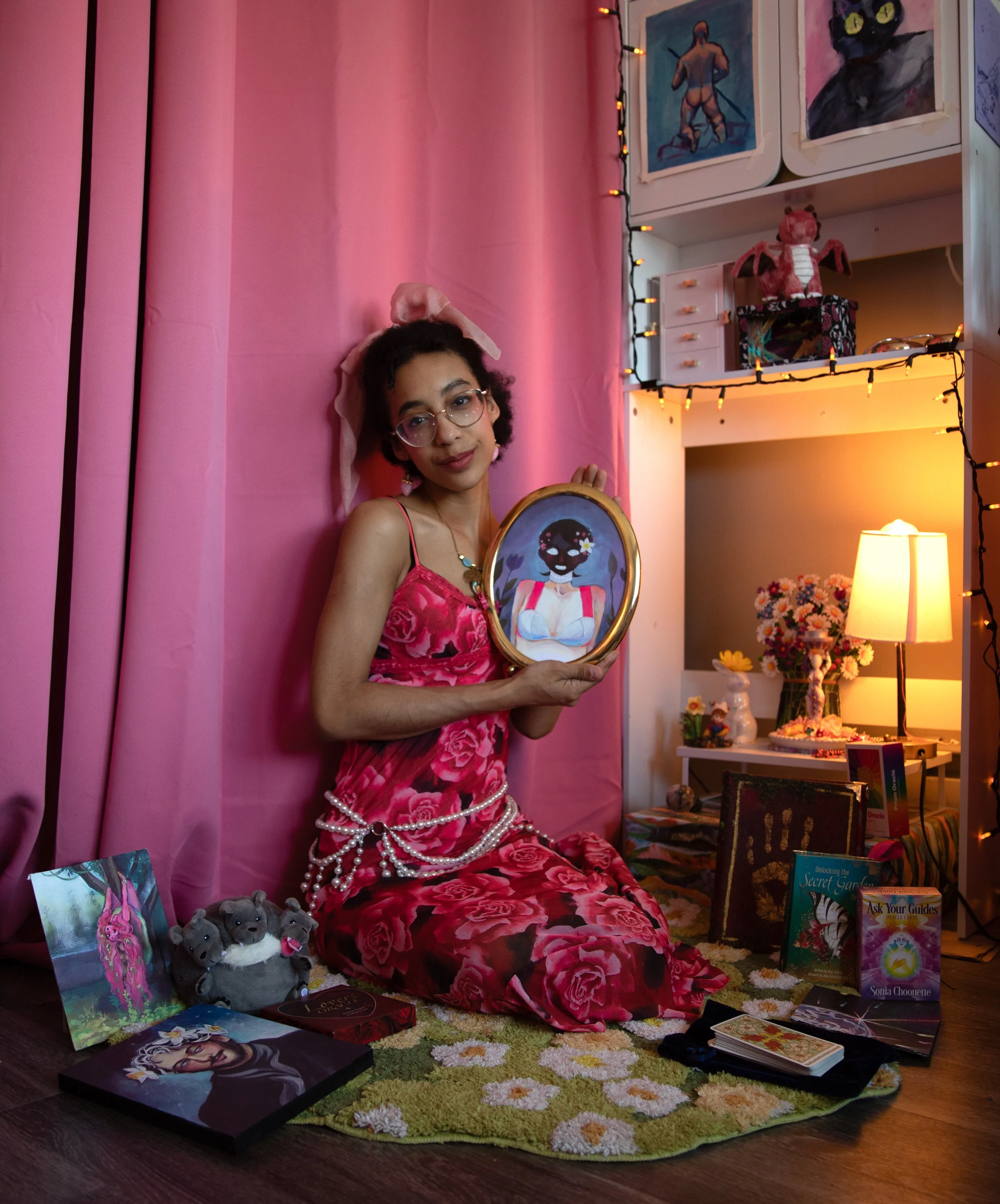 After becoming a witch in June of 2023, her world became cemented in the esoteric and her relationship with her Spirit Team, beginning with Nil, The God of Self Love. Go and seek Nil, as she lies in many paintings completed by Isamar. She lies amongst the flowers, laughing, with a head casted in the shadows, reminding Isamar to always come back home to herself.